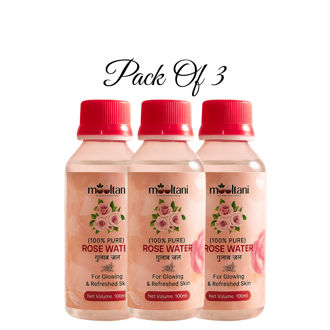 Introducing our premium Mooltani Pure Rose Water in a value-packed set of 3 bottles (100ml each), crafted with love and care using the traditional steam distillation method from handpicked Desi roses. Experience natureβs most gentle skincare elixir, designed to purify, hydrate, and refresh your skin naturally.